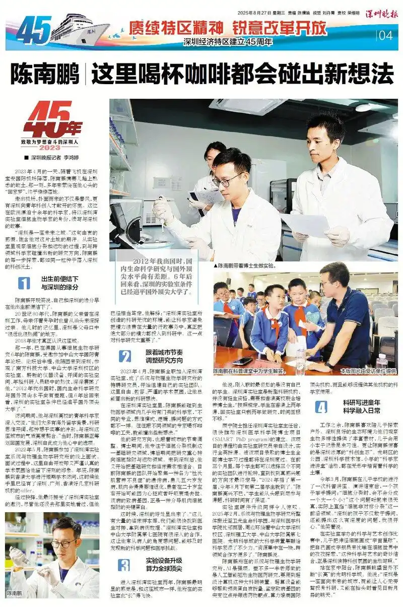 “深圳是一座未来之城。”这句由衷的感慨,饱含他对这片土地的期许。从实验室里观察细胞分裂和运动的过程,到与跨领域科学家碰撞出新的研究方向,陈南鹏的每一步探索,都如同一粒种子落入深圳的科创沃土。